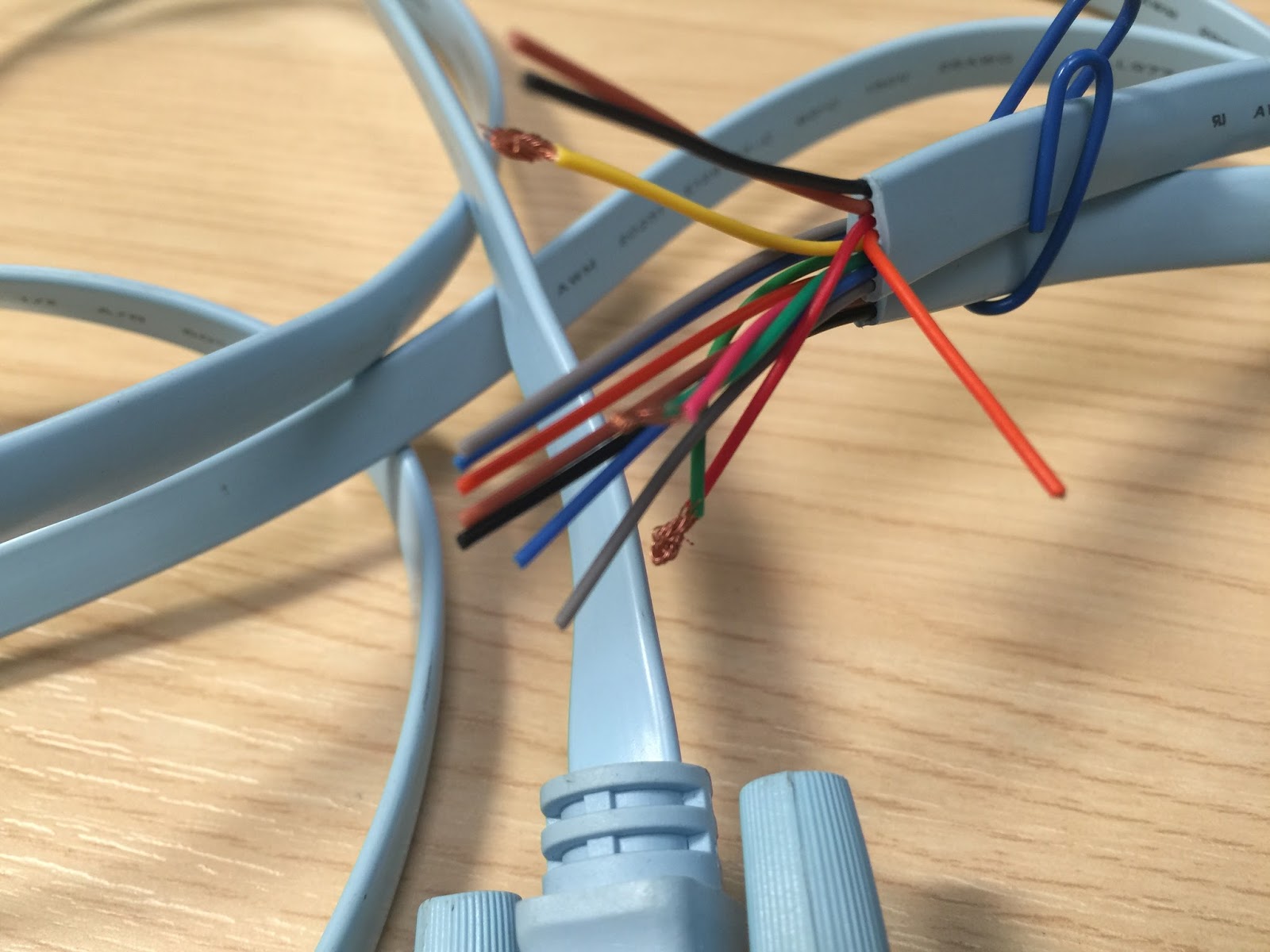 Once identified it is simply a case of stripping the insulation on the required pins back, (red, green and yellow) to reveal the copper beneath, they could be twisted together again in the right order to make a Null Modem Cable with DB9 on both ends.